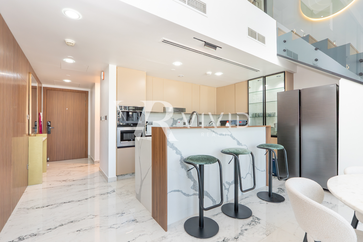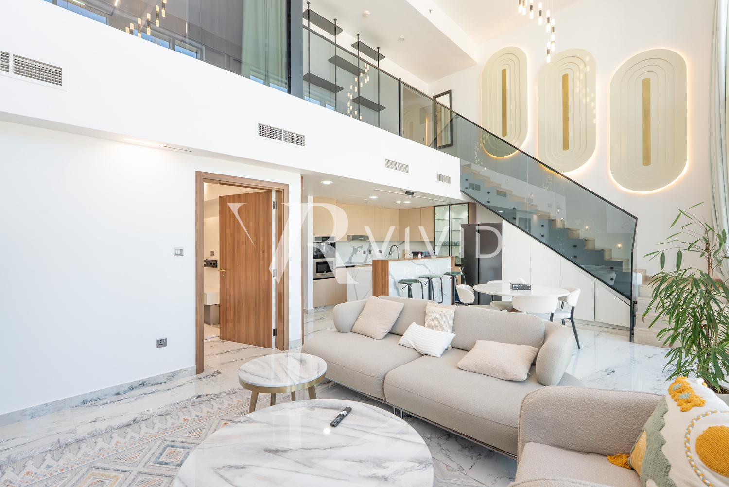 Elegant marble flooring, feature wall with mounted TV, designer furniture, and statement lighting elevate the interior throughout. The upper-level glass balcony overlooks the living space, enhancing the loft-style appeal. Thoughtfully upgraded with premium finishes and modern details, this home offers seamless comfort, style, and functionality.