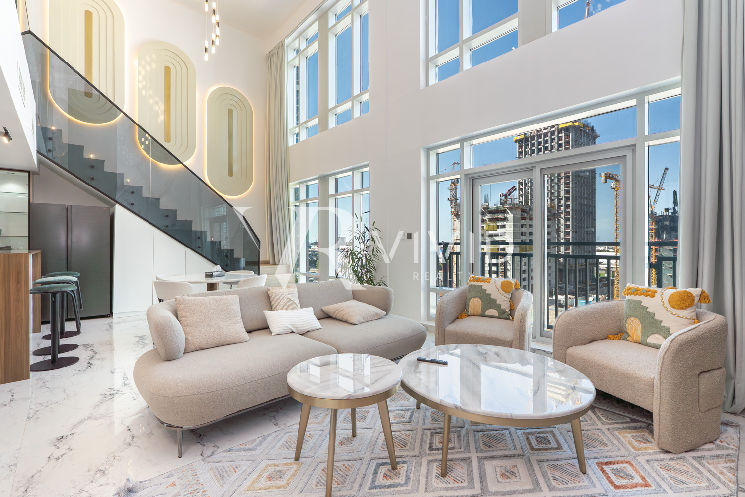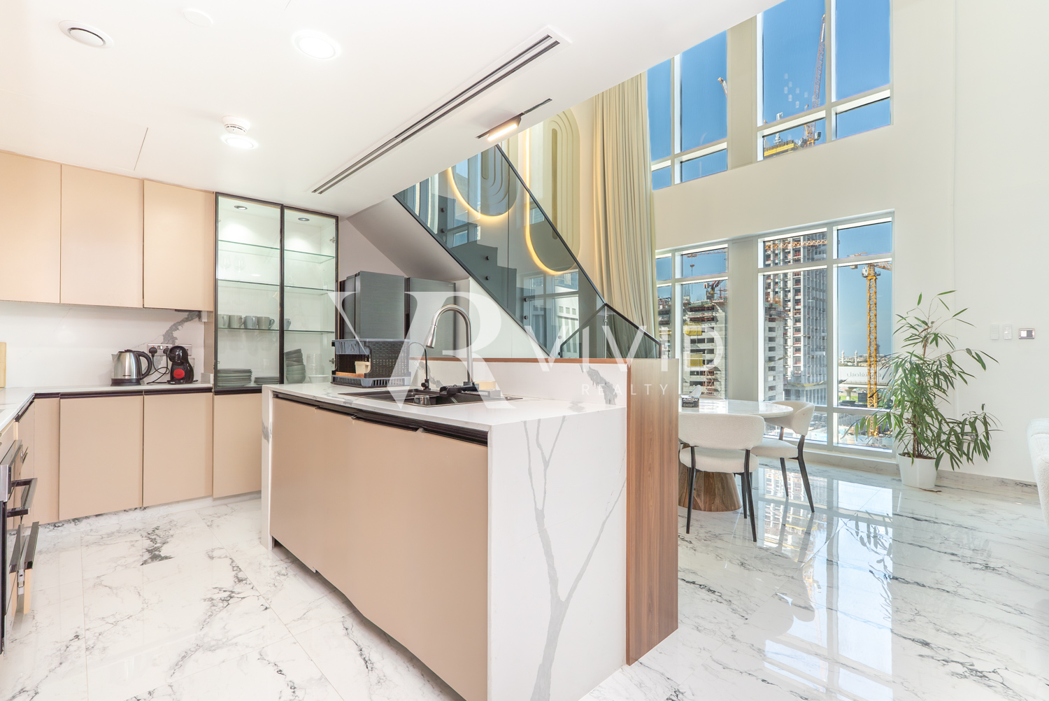 Spanning 1,727 sq ft, the unit features a dramatic double-height living area flooded with natural light, creating an impressive open and airy atmosphere. The layout includes 2 generously sized bedrooms plus a study, a modern open kitchen with marble waterfall countertops, built-in appliances, sleek cabinetry, and a breakfast bar ideal for everyday living and entertaining.